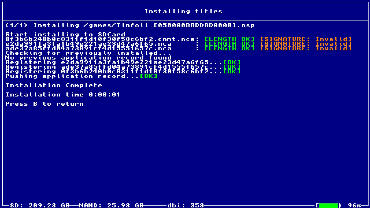 우선 이 DBI를 이용해 홈브류 메뉴와 틴포일을 설치해주었습니다.