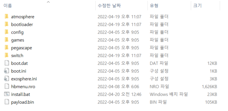 그리고 설치된 SD카드를 확인, payload.bin 파일만 따로 다른 곳으로 복사를 해주고, 스위치의 RCM모드에 진입하기 위해 준비를 해주었습니다.