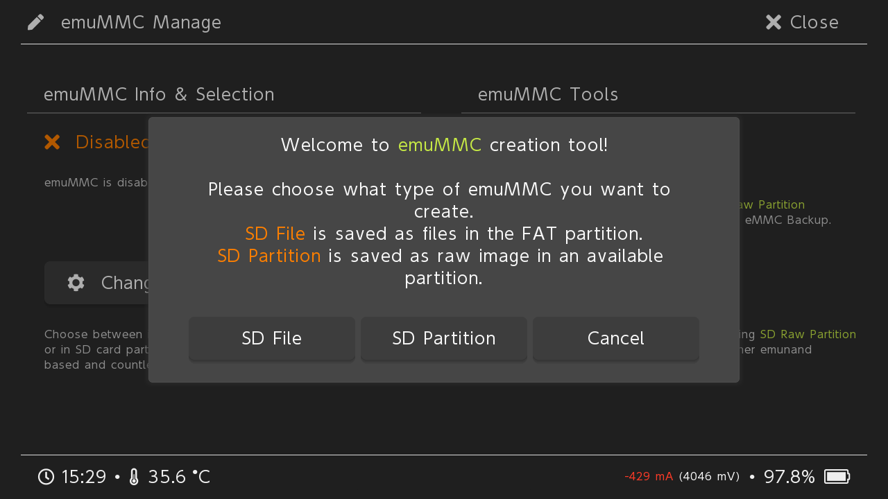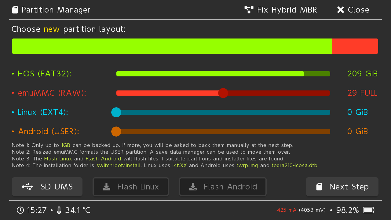 파티션 매니져에 들어가 emuMMC를 29 FULL로 설정해주었습니다.