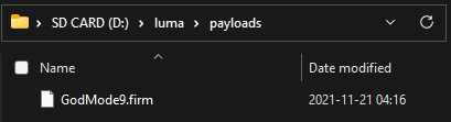 11. GodeMode9의 압축을 푼 파일 안에서 'GodMode9.firm 파일을 12번에서 만든 'payloads' 폴더 안에 넣어줍니다.